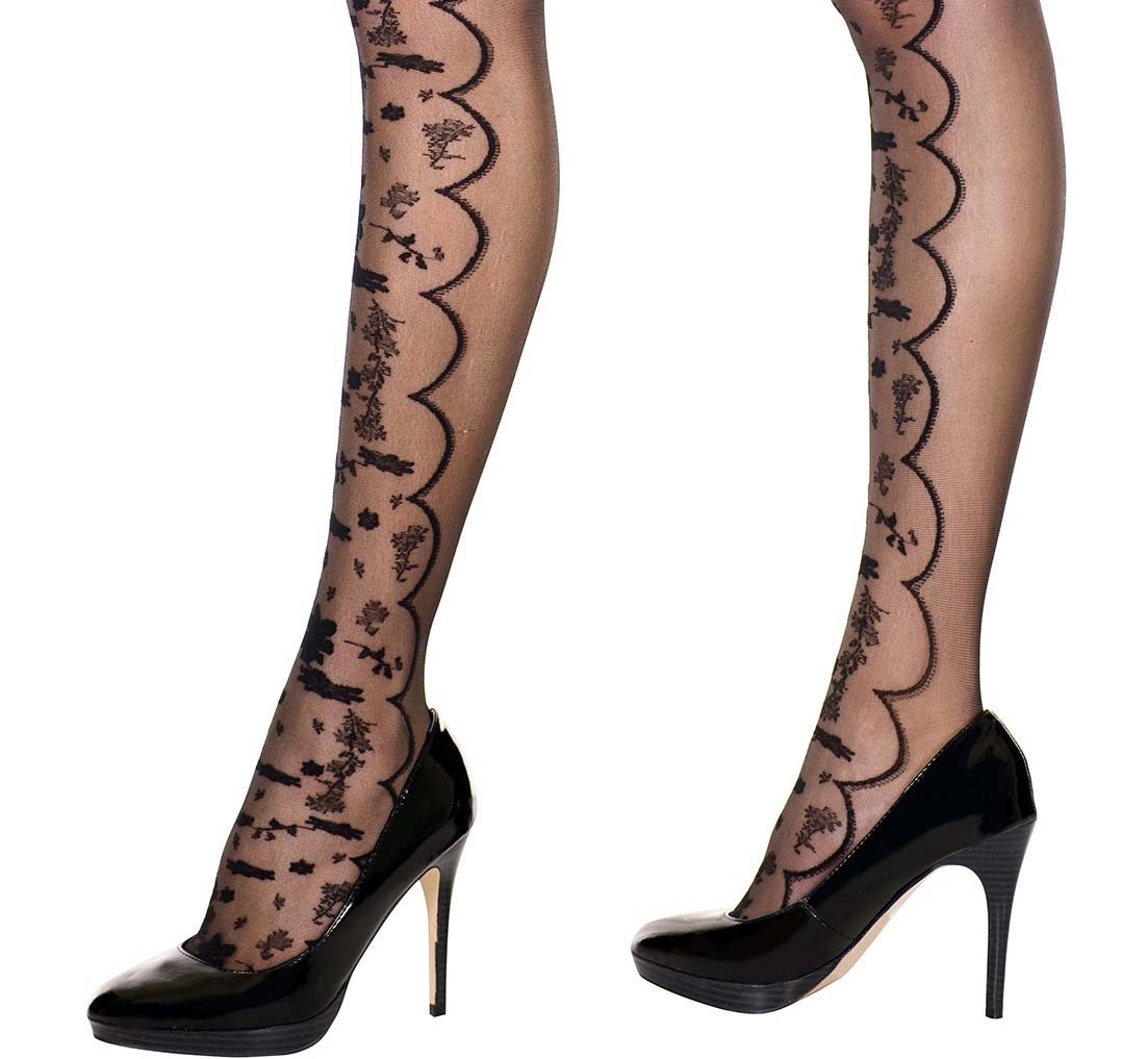Sexyなランジェリーやコスチュームを扱う、アメリカの有名ブランドMUSIC LEGSが登場!! ブラックのシアーストッキングにフロントにエレガントなフラワー模様を施した、なんとも珍しいパンティストッキング♪